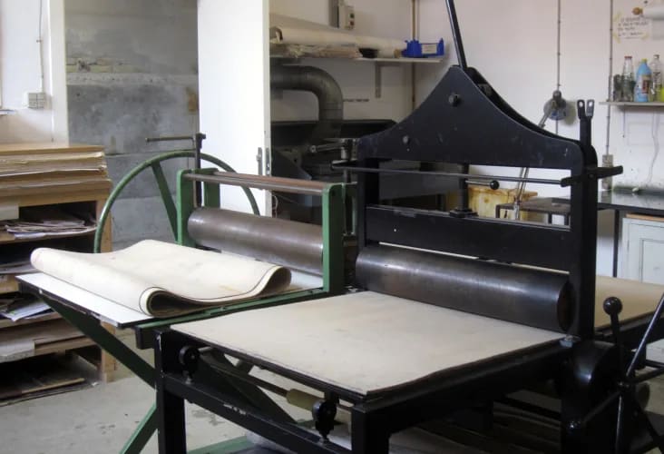 Værkstedet er non-toxic (betyder rens af plader med madolie bl.a.). Vi har to trykpresser til dybtryk og højtryk, lodret ætsetank, belysnngsskab til FP-plader, vandkar i flere str. op til 70x100+, tørrestativ, plader til at ligge tryk i pres.